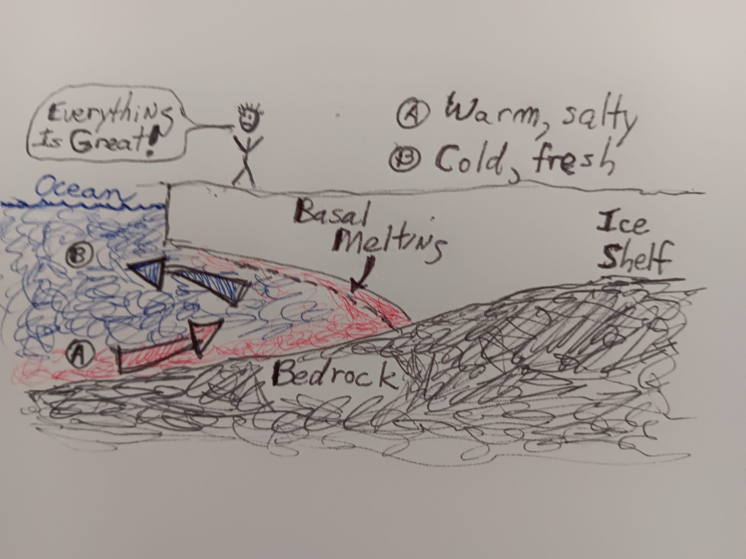 The image at the top is a simplified view of basal melting. The basic point of the analogy is that the deterioration of the ice shelf as depicted occurs from below, as warmer water (“A”) eats away at the underneath of the ice. And it does so out of view.